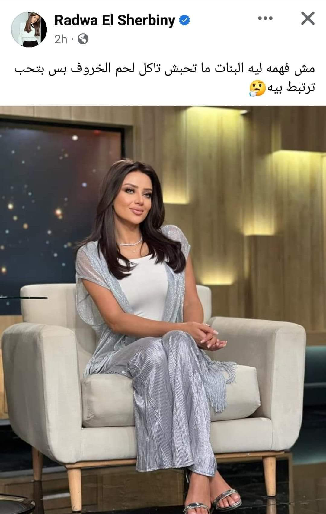 وكانت رضوى الشربيني قد نشرت بوست من خلال صفحتها الشخصية كتبت فيه “مش فهمه ليه البنات ما تحبش تاكل لحم الخروف بس بتحب ترتبط بيه”.