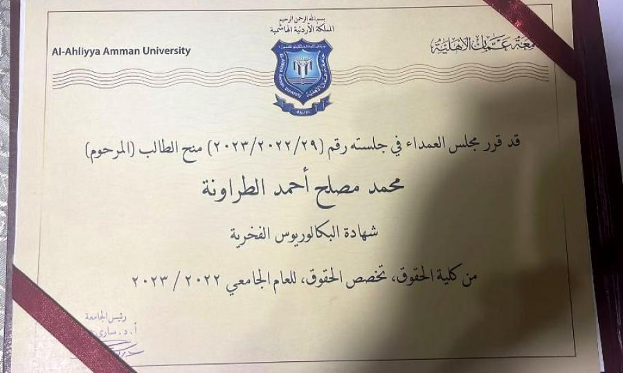 كان من المفترض أن يحضر محمد "نجل “ الاستاذ الدكتور مصلح الطراونة نائب رئيس جامعة عمان الاهلية وعميد كلية الحقوق في الجامعة " حفل تخرجه يوم السبت 22-7-2023، ولكن مشيئة الله قضت أن يغادر محمد الى جوار ربه اثر حادث سير مؤخرا ... حيث منحه مجلس عمداء جامعة عمان الاهلية شهادة البكالوريوس الفخرية بتخصص الحقوق ...واستلمت الشهادة نيابة عنه شقيقته ناتالي ......... وقد كتب أ.د .مصلح الطراونة كلمة رثاء تدمي القلوب لنجله المرحوم محمد في يوم تخرّجه لكنه رفض نشرها لئلا يؤذي مشاعر رفاقه الخريجين ،هذا نصها :