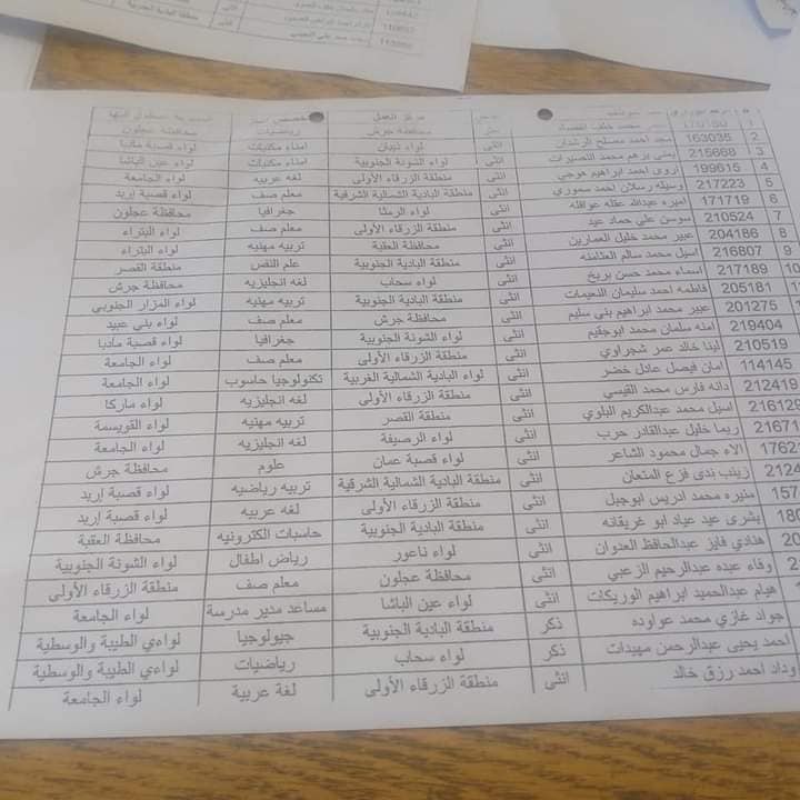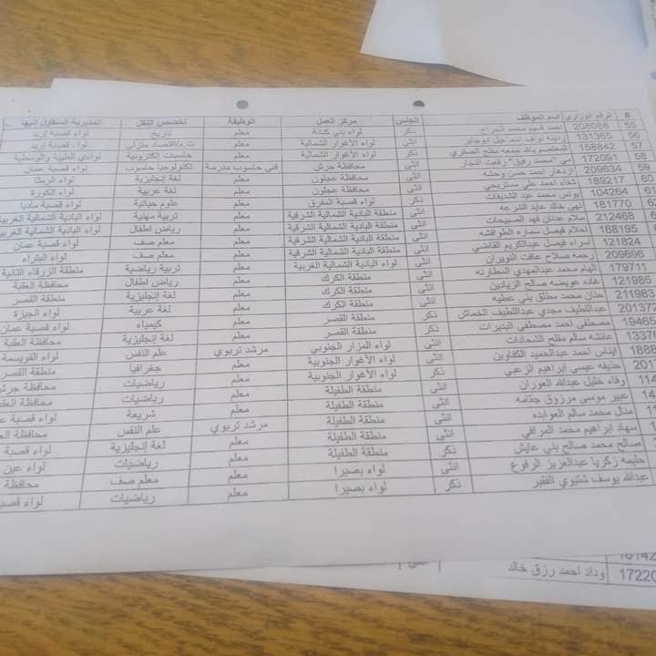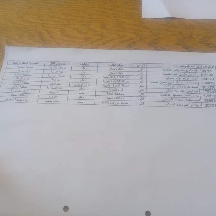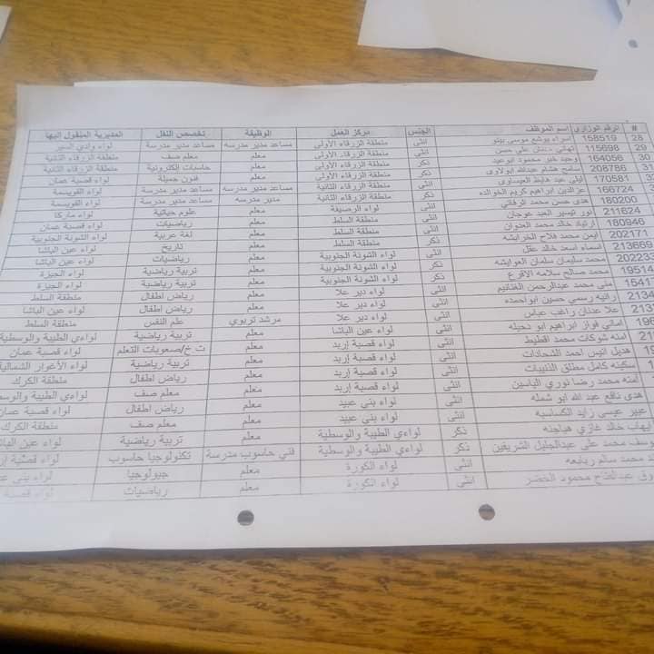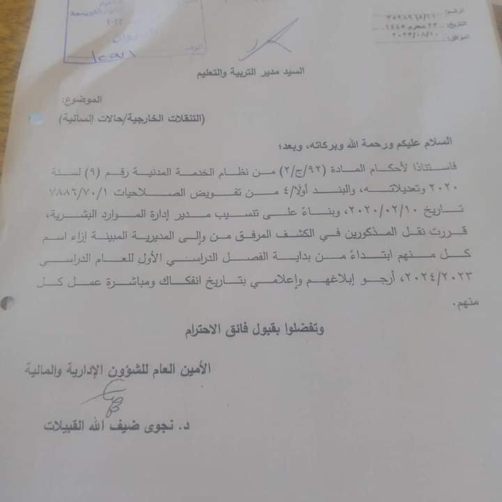 ووفق كتاب قررت الأمينة العامة لشؤون الإدارية والمالية، الدكتورة نجوى قبيلات، "نقل المذكورين في الكشف المرفق من وإلى المديرية المبينة إزاء اسم كل منهم ابتداءً من بداية الفصل الدراسي الأول للعام الدراسي 2023/2024″، راجية إبلاغهم وإعلامها بتاريخ انفكاك ومباشرة عمل كل منهم.