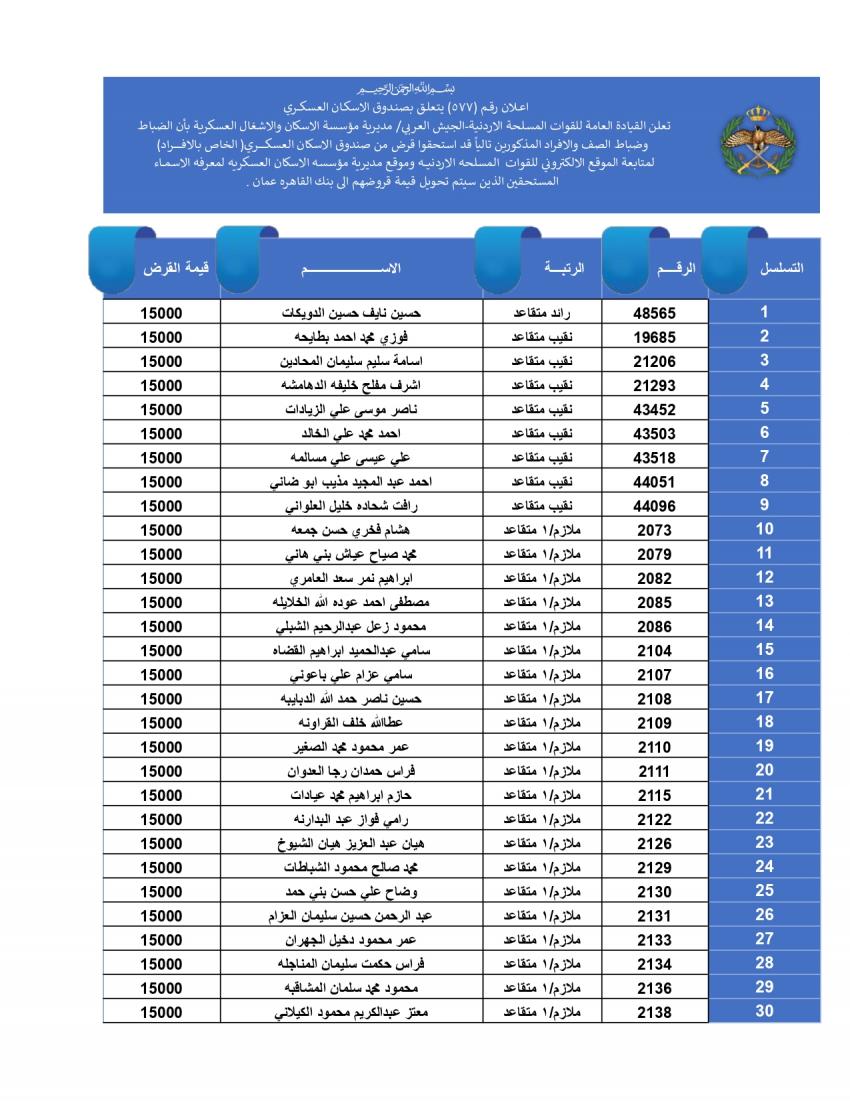 تعلن القيادة العامة للقوات المسلحة الأردنية – الجيش العربي/ مديرية مؤسسة الإسكان والأشغال العسكرية بان الضباط وضباط الصف والأفراد المبينة أسماءهم أدناه قد استحقو قرض الإسكان العسكري وعلى الضباط المستفيدين من صندوق إسكان الضباط مراجعة مديرية الإسكان والأشغال العسكرية خلال ساعات الدوام الرسمي اعتباراً من يوم الاحد الموافق 3/9/2023 للحصول على القرض والضباط وضباط الصف والأفراد المستفدين من صندوق الإسكان العسكري (الخاص بالإفراد) سيتم تحويل قيمة قرض الإسكان الى بنك القاهره عمان لمتابعة الموقع الالكتروني للقوات المسلحه الاردنيه لمعرفة اسماء المستحقين الذين سيتم تحويل قيمة قروضهم للبنك .