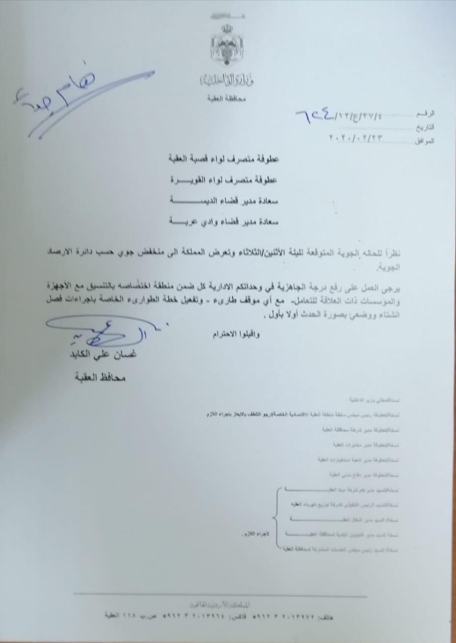 محافظة العقبة غسان الكايد يرفع حالة الطوارئ إلى القصوى في جميع ارجاء المحافظة نظرا لعدم استقرار الحالة الجوية.