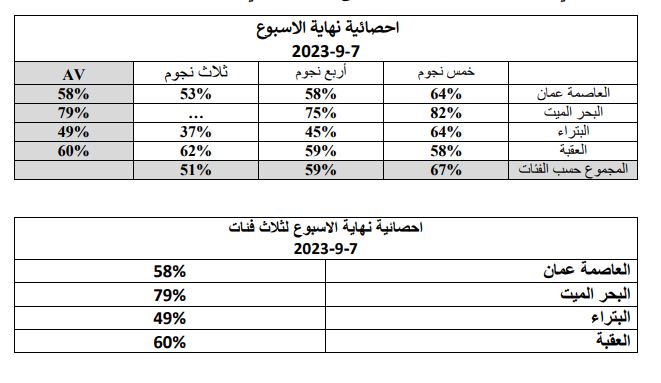 واعتبر هلالات، أن الأردن يشهد حركة سياحية مميزة في الوقت الحالي وستستمر الحركة السياحية على هذا النحو في الفترة المقبلة. وحول نسب إشغال الفنادق نهاية الأسبوع الحالي، أوضح هلالات، أن أعلى نسب إشغال في الفنادق كانت في البحر الميت وجاءت جميعها على النحو التالي: