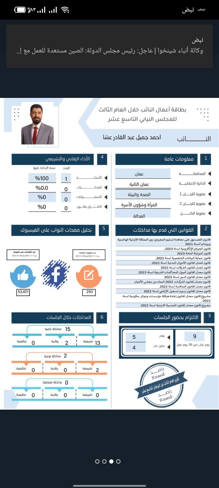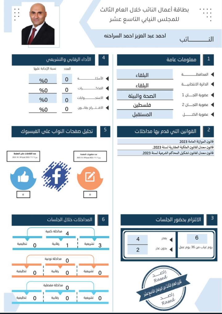 أظهر تقرير مركز راصد لمراقبة الأداء البرلماني أن (59) نائبا لم يتقدموا بأي سؤال نيابي خلال العام الثالث من عمر مجلس النواب التاسع عشر، فيما لم يقدّم (7) نواب أي مداخلة تحت قبة البرلمان منهم (5) لم يتقدّموا بأي سؤال نيابي أيضا.كما أظهر التقرير أن (7) نواب آخرين لم يتقدموا خلال العام الثالث من عمر المجلس إلا بمداخلة يتيمة واحدة!قراءة التقرير وبطاقات أداء النواب التي أصدرها "راصد"، تشير إلى أن عدد الأسئلة النيابية ليس معيارا كافيا لتقييم أداء النائب، فبعض النواب تقدّموا بسؤال نيابي أو أكثر لكنهم لم يحصلوا على أي اجابة، كما أن بعض النواب الذين لم يتقدّموا بأسئلة نيابية كانوا من النشطين في تقديم المداخلات الكمية والنوعية والمفصلية تحت قبة البرلمان.