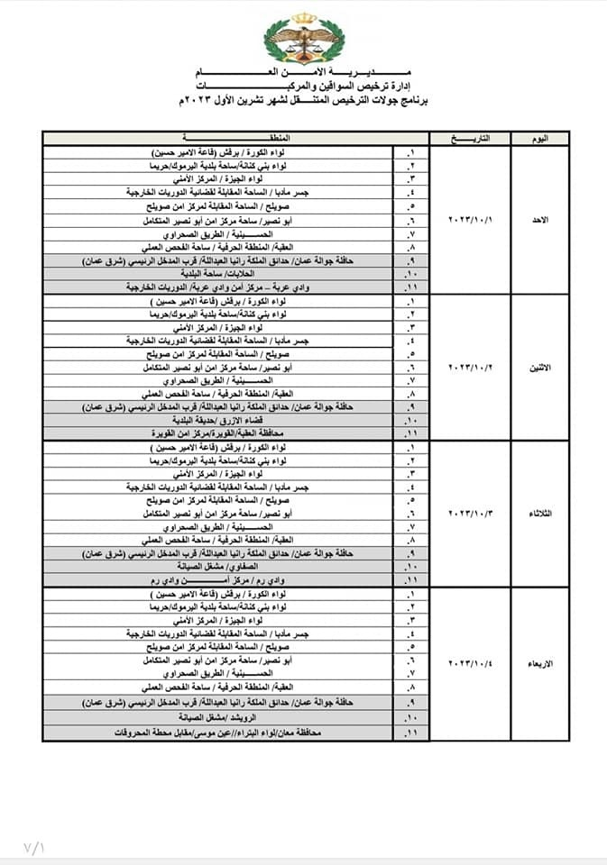 أعلنت إدارة ترخيص السواقين والمركبات مواعيد العمل بجولات الترخيص المتنقل ضمن المبادرة الابتكارية (بنوصلك) خلال شهر تشرين الأول/ أكتوبر لعام 2023م في عدد من مناطق المملكة. وبحسب الإعلان المنشور على صفحة مديرية الأمن العام على "فيسبوك"، ستكون ساعات الدوام للترخيص المتنقل من يوم الأحد ولغاية يوم الأربعاء من الساعة 8:00 صباحاً وحتى الساعة 2:00 ظهراً، ويوم الخميس من الساعة 8:00 صباحاً ولغاية الساعة 1:00 ظهراً.