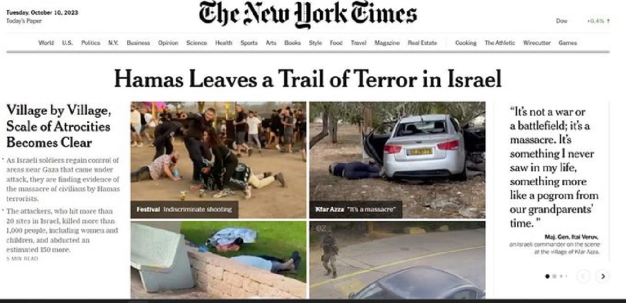 مجلة نيويورك تايمز الاميركية عنونت افتتاحيتها صباح هذا اليوم على نحوالتالي : حماس تخلّف آثار رعب في “إسرائيل