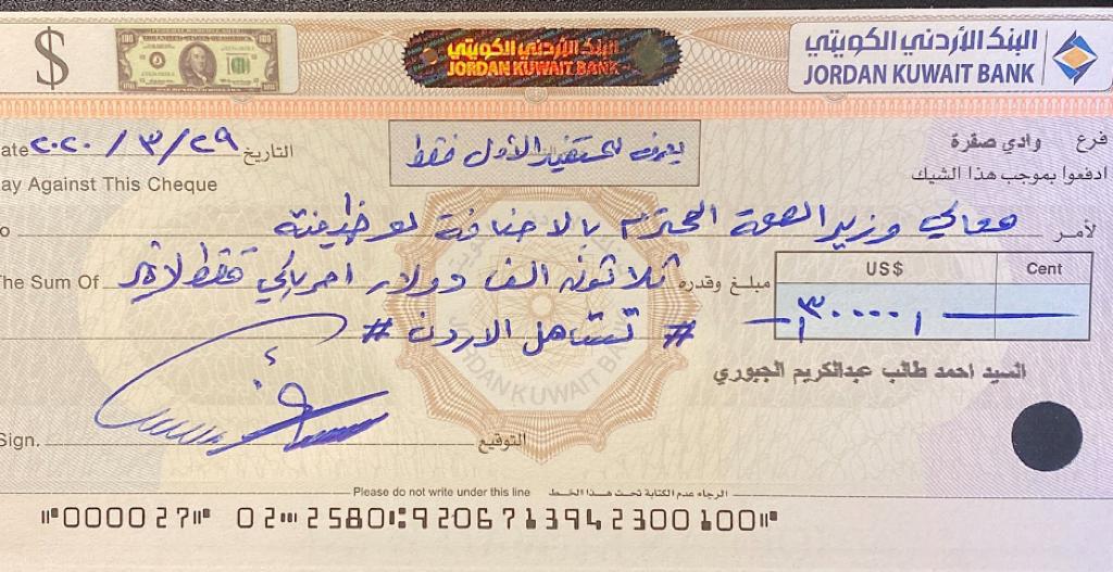 قام رجل الاعمال العراقي احمد الجبوري بالتبرع بملغ ثلاثين الف دولار لوزارة الصحة و قام النائب قيس زيادين بتسليم الشيك للحكومة. ووجه الجبوري الرساله التالية :