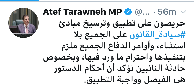 قال المهندس عاطف الطراونة رئيس مجلس النواب : حريصون على تطبيق وترسيخ مبادئ #سيادة_القانون على الجميع بلا استثناء، وأوامر الدفاع الجميع ملزم بتنفيذها واحترام ما ورد فيها، وبخصوص حادثة النائبين نؤكد أن أحكام الدستور هي الفيصل وواجبة التطبيق، جاء ذلك من خلال ما نشره عبر حسابه الخاص على تويتر