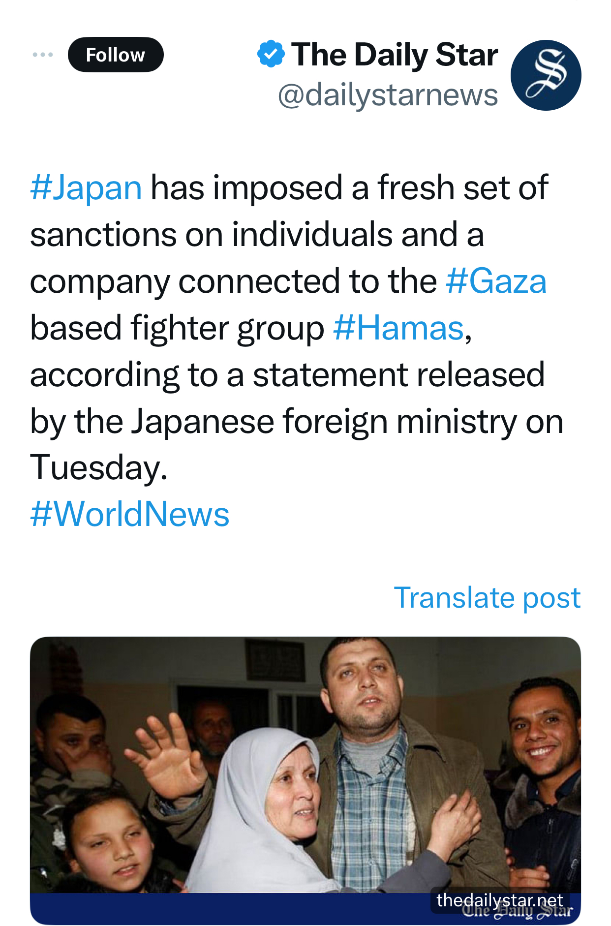 بيان أصدرته وزارة الخارجية اليابانية يوم الثلاثاء، أن طوكيو فرضت مجموعة جديدة من العقوبات على أفراد وشركة مرتبطين بحركة حماس في غزة.