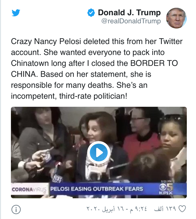 وعلق ترامب على الفيديو كاتبا: "نانسي بيلوسي المجنونة حذفت هذا المقطع من حسابها على تويتر. أرادت أن يحتشد الجميع في المدينة الصينية بعد أن أغلقت الحدود مع الصين".
