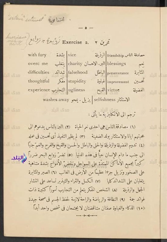 وعرض غلاف كتاب الصف الرابع الابتدائي لسنة 1919 لتلاميذ المدارس المصرية، والذي كان يدرس منه أساسيات الترجمة.