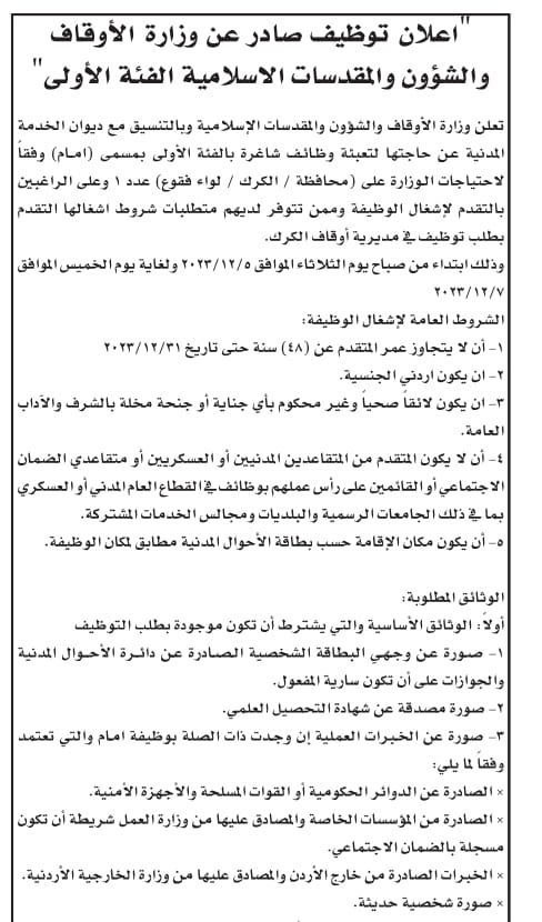الأوقاف وشؤون المقدسات الإسلامية تعلن عن حاجتها لتعبئة وظائف شاغرة بالفئة الاولى ...تفاصيل