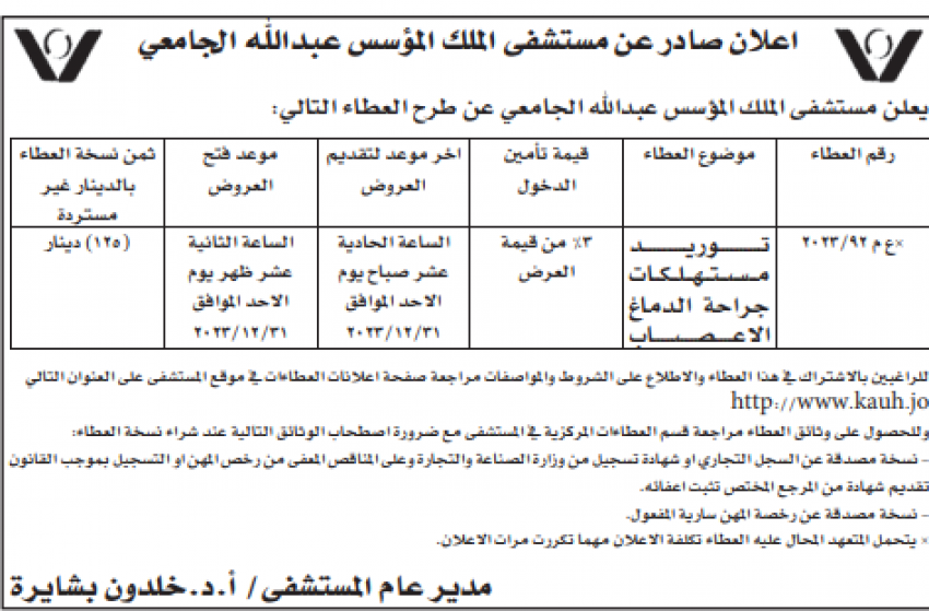 عطاء صادر عن مستشفى الملك المؤسس عبدالله الجامعي