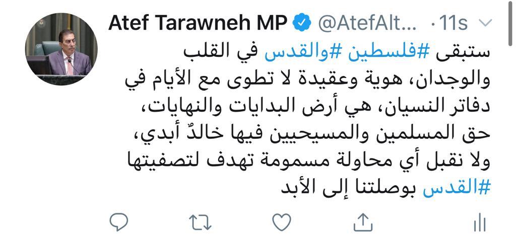 وأضاف الطراونة في تغريدة له عبر تويتر: هي أرض البدايات والنهايات وحق المسلمين والمسيحيين فيها خالدٌ أبدي، ولا نقبل أي محاولة مسمومة تهدف لتصفيتها.
