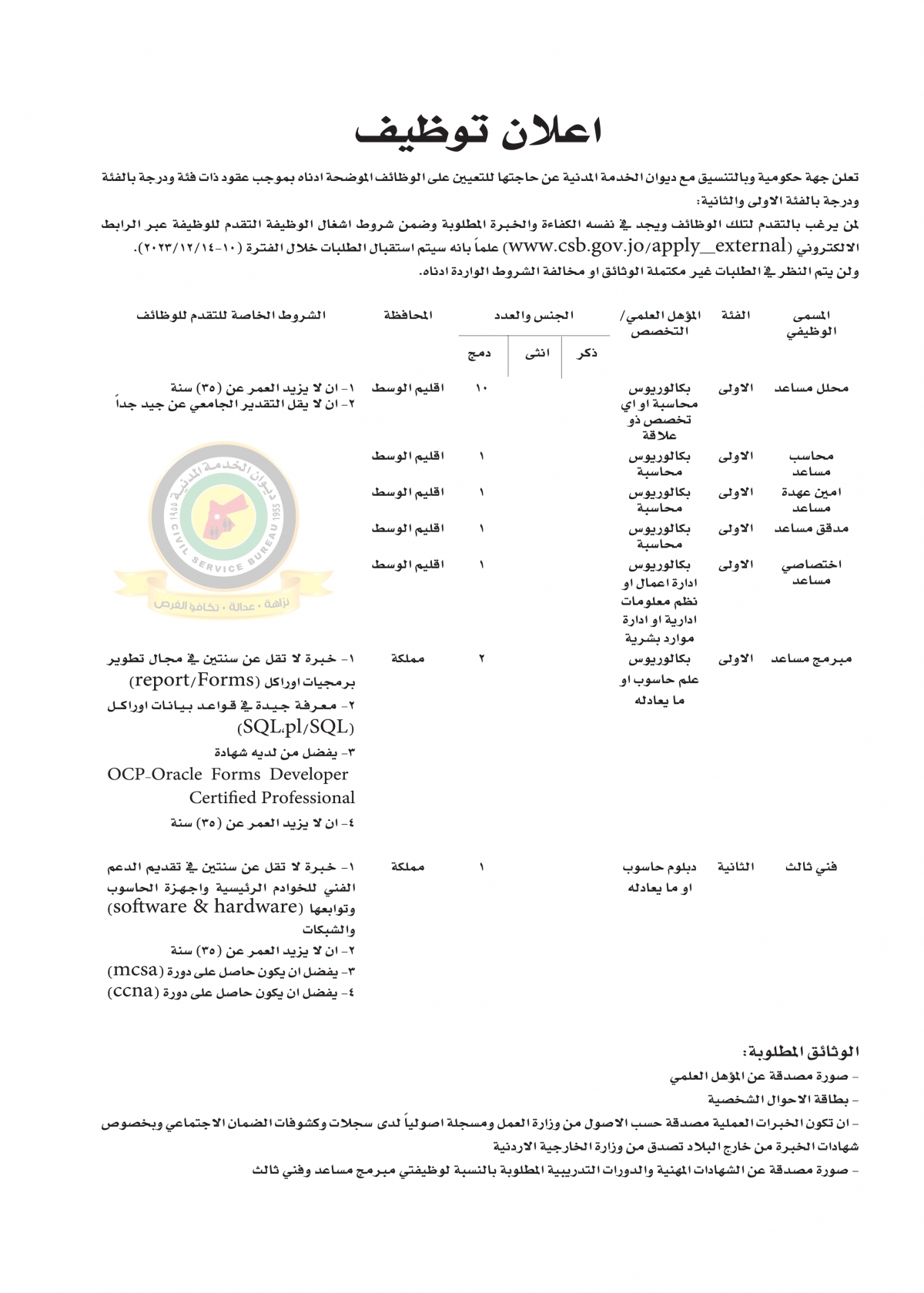 أعلنت جهة حكومية وبالتنسيق مع ديوان الخدمة المدنية عن حاجتها لتعبئة وظائف شاغرة . وتاليًا التفاصيل في الاعلان المرفق: