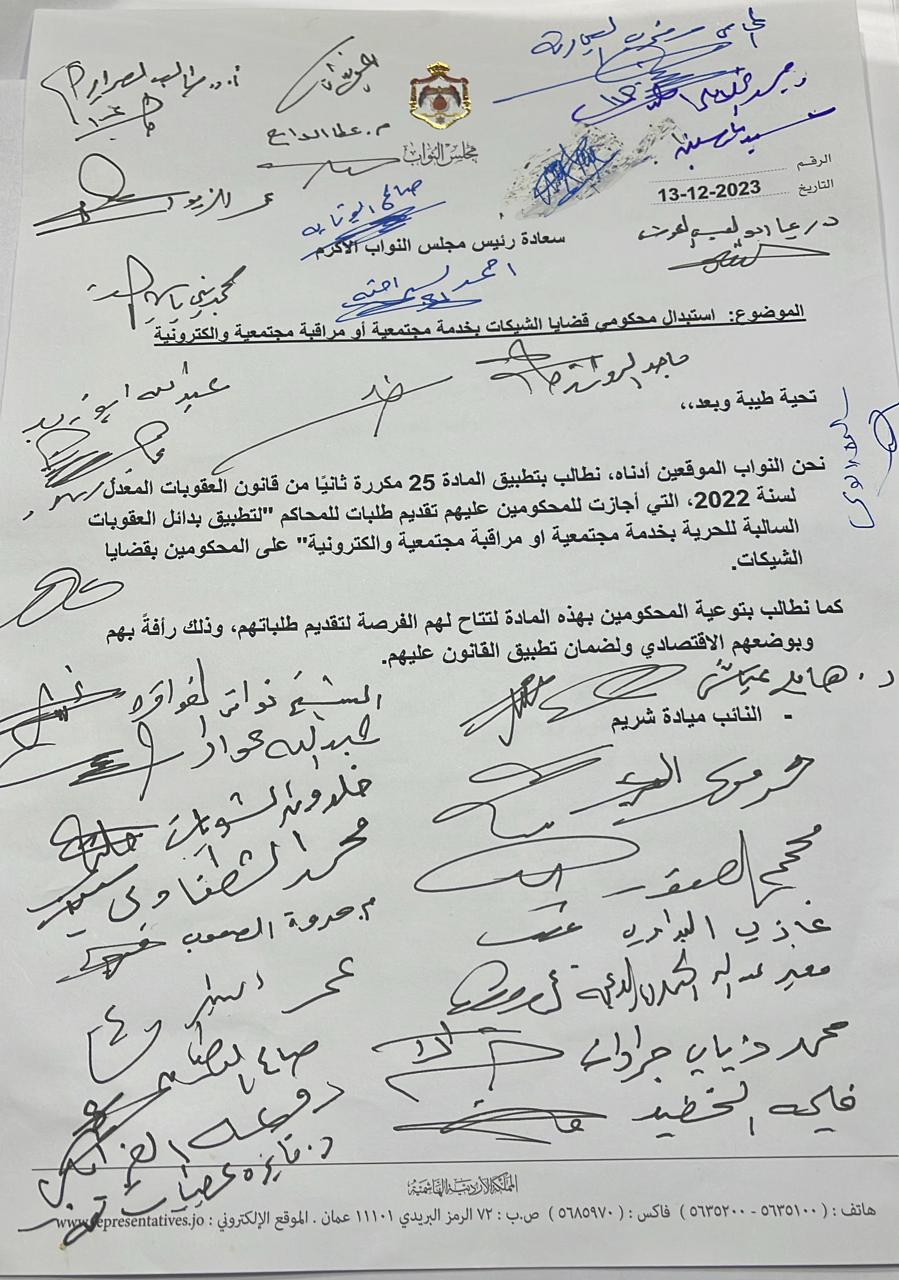 "تبنت مساعد رئيس مجلس النواب، النائب ميادة شريم، مذكرة نيابية حول "استبدال محكومي قضايا الشيكات بخدمة مجتمعية أو مراقبة مجتمعية الكترونية". وطالبت شريم وعدد من النواب، من خلال المذكرة النيابية، بتطبيق المادة 25 مكررة ثانيًا من قانون العقوبات المعدللسنة ،2022 التي أجازت للمحكومين عليهم تقديم طلبات للمحاكم "لتطبيق بدائل العقوبات السالبة للحرية بخدمة مجتمعية او مراقبة مجتمعية والكترونية" على المحكومين بقضايا الشيكات.كما تضمنت المذكرة المطالبة بتوعية المحكومين بهذه المادة لتتاح لهم الفرصة لتقديم طلباتهم، وذلك رأفة بهموبوضعهم الاقتصادي ولضمان تطبيق القانون عليهم.