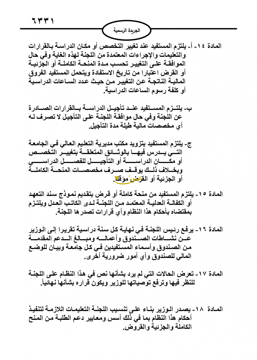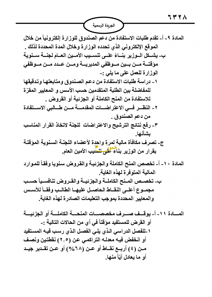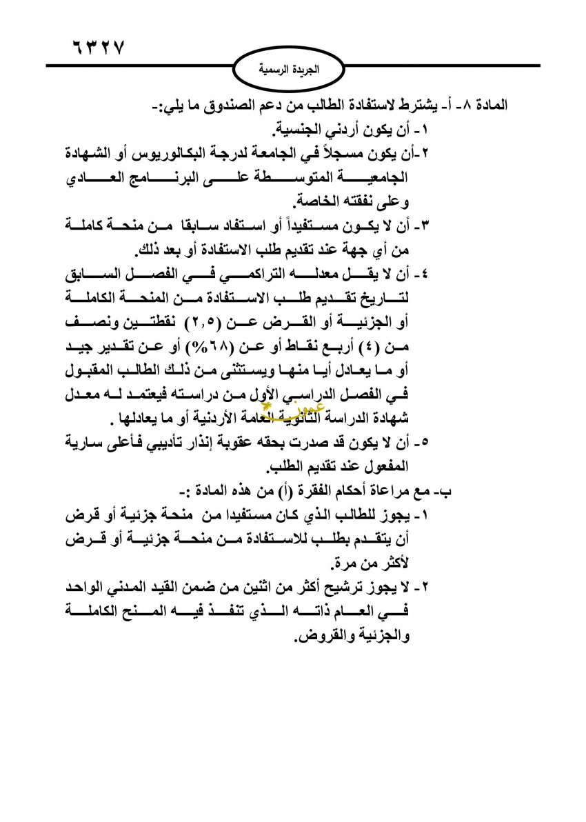 حرمت الحكومة، الطلبة في الجامعات الرسمية، الحاصلين على معدل أقل من 68 بالمئة، من الاستفادة من المنح والقروض الجامعية. وبحسب النظام الجديد، والذي نشرته في الجريدة الرسمية واطلعت عليه عمون، فإن الحكومة قامت بتعديل شروط الاستفادة من دعم صندوق الطالب، بحيث أن لا يقل معدل الطالب التراكمي في الفصل السابق لتاريخ تقديم طلب الاستفادة من المنحة أو القرض 2.5 من 4 نقاط أو عن 68 بالمئة أو عن تقدير جيد، في حين كان في السابق لا يقل معدل الطالب التراكمي عن 60 بالمئة أو عن نقطتين من أصل 4 نقاط. واشترطت الحكومة، ان يكون الطالب مسجلًا في الجامعة لدرجة البكالوريوس أو الشهادة الجامعية المتوسطة على البرنامج العادي وعلى نفقته الخاصة. وكما حرمت الطلبة الحاصلين على عقوبة الإنذار التأديبي في الجامعات فأعلى من التقدم بالطلب للاستفادة من الصندوق، في حين كانت في السابق تحرم من صدرت بحقه عقوبة تجاوزت الإنذار.