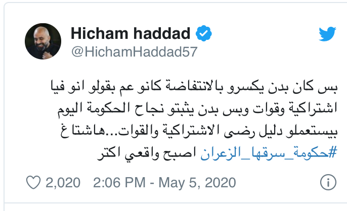 الممثل ومقدّم برامج “لهون وبس “على شاشة LBCI هشام حداد فضح بدوره الحكومة التي سرقها الزعران -حسب تعبيره- ، مستغرباً في السياق عينه كيف كانوا يتهمون احزاباً بركوب موجة الثورة لتضليل الرأي العام كما ورد في تغريدته على “تويتر ” التي جاء فيها “بس كان بدن يكسرو بالانتفاضة كانو عم بقولو انو فيا اشتراكية وقوات وبس بدن يثبتو نجاح الحكومة اليوم بيستعملو دليل رضى الاشتراكية والقوات…هاشتاغ #حكومة_سرقها_الزعران اصبح واقعي اكتر