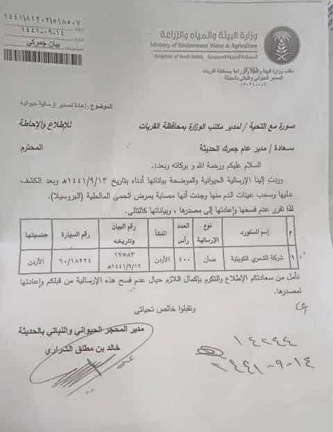 ردا على الخبر المتداول عبر وسائل الاعلام والتواصل الاجتماعي حول إعادة احدى وسائط النقل المحملة بالاغنام الحية من مركز الحدود الحديثة السعودية على خلفية تسجيل عينه إيجابية لمرض البروسيلا ( الحمى المالطيه).