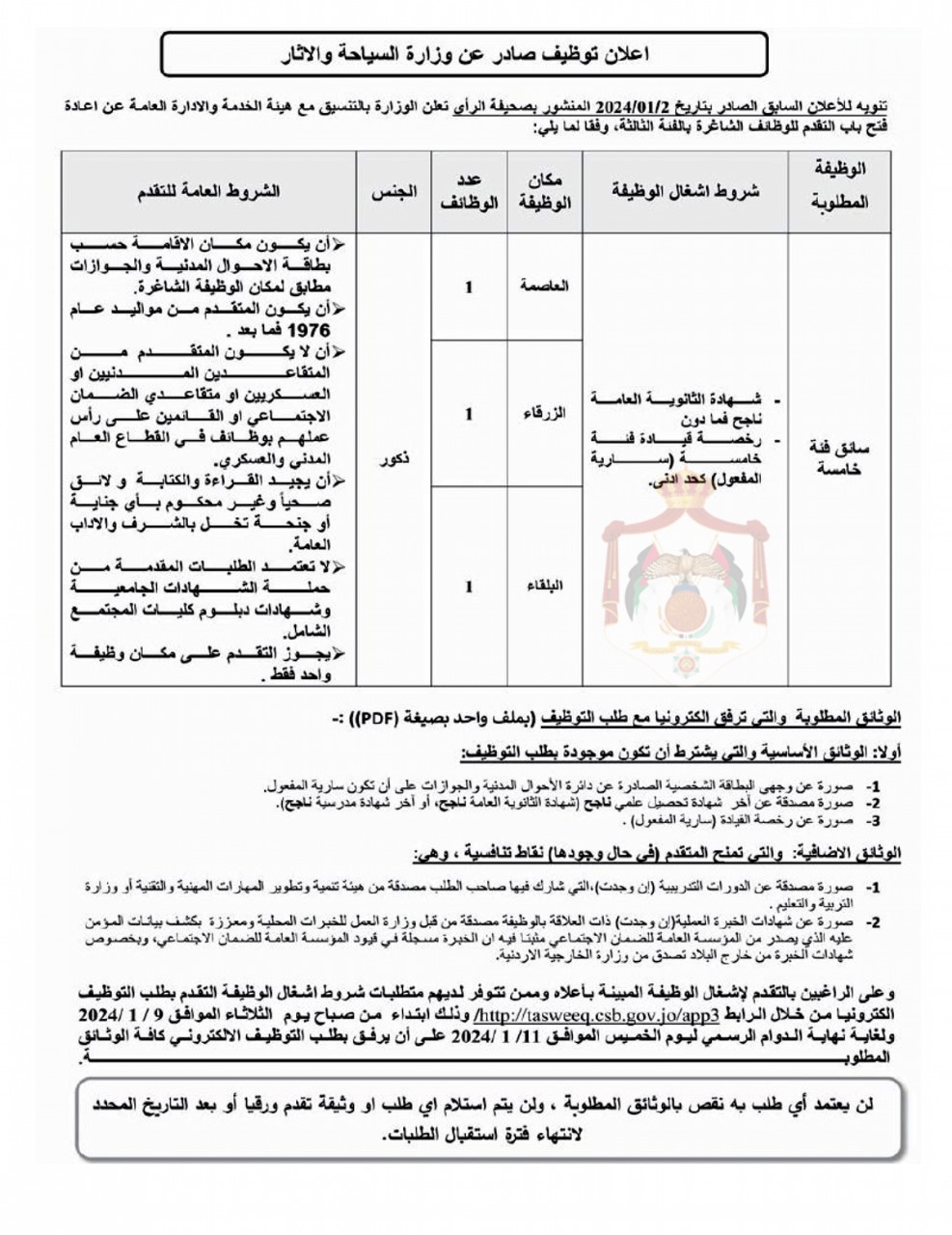 أعلن ديوان الخدمة المدنية وبالتنسيق مع عدد من الدوائر الحكومية والخاصة عن وظائف شاغرة .وأعلنت وزارة السياحة عن توفر فرص عمل في الفئة الثالثة، وحاجتها لتعيين 3 سائقين.