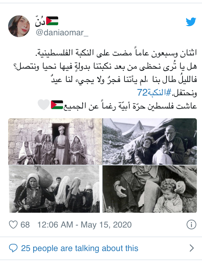 ودعا الفلسطيني بسام الوزير أبناء الشعب الفلسطيني في الوطن والشتات للمشاركة في "العاصفة الإلكترونية #المقاومةطريقالعودة و#سنعودإلىفلسطين_٧٢ـ بمناسبة الذكرى الثانية والسبعين لنكبة الشعب الفلسطيني وتشريده من أرضه و وطنه، مؤكدين على الجدوى المستمرة للمقاومة الباسلة في الوقت الذي تعيش فيه القضية الفلسطينية أخطر المنعطفات التاريخية".ولم يغب مُفتاح البيوت القديمة عن المنشورات والتغريدات، إذ يعبر من خلاله الفلسطينيون رمزياً عن حلمهم في العودة إلى المُدن والقرى والبيوت التي هُجروا منها قسراً.وتساءلت الناشطة دانيا عمر عبر موقع "تويتر": "اثنان وسبعون عاماً مضت على النكبة الفلسطينية، هل يا تُرى نحظى من بعد نكبتنا بدولةٍ فيها نحيا ونتصل؟ فالليلُ طال بنا، لم يأتنا فجرٌ ولا يجيء لنا عيدٌ ونحتفل، #النكبة72، عاشت فلسطين حرّة أبيّة رغماً عن الجميع".وأرفق الناشط أحمد القيشاوي صورة للحظة تهجير عدد من الفلسطينيين من قًراهم، بنص مؤثر قال فيه: "لم ننس البداية، لا مفاتيح بيوتنا، ولا مصابيح الطريق التي أضاءها دمنا، لا الشهداء الذين أخصبوا وحدة الأرض والشعب والتاريخ، ولا الأحياء الذين ولدوا على قارعة الطريق، الذي لا يؤدي إلا إلى الوطن الروح، ما دامت روح الوطن حية فينا، #النكبة72، #Nakba72" ( العربي الجديد )