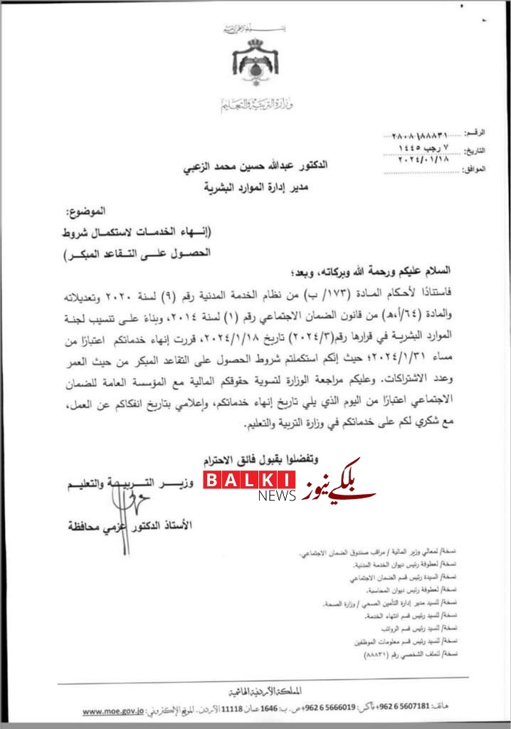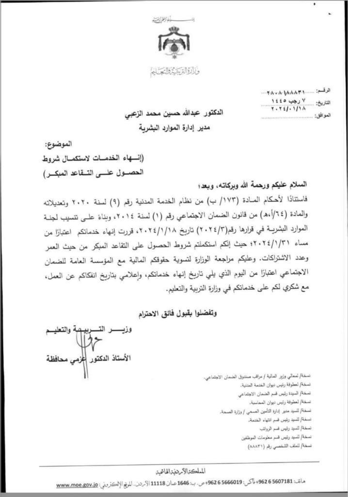 قرر وزير التربية والتعليم، الدكتور عزمي محافظة، وبناءً على تنسيب لجنة الموارد البشرية إنهاء خدمات الدكتور عبدالله الزعبي مدير ادارة الموارد البشرية ، وإحالته إلى التقاعد المبكر.