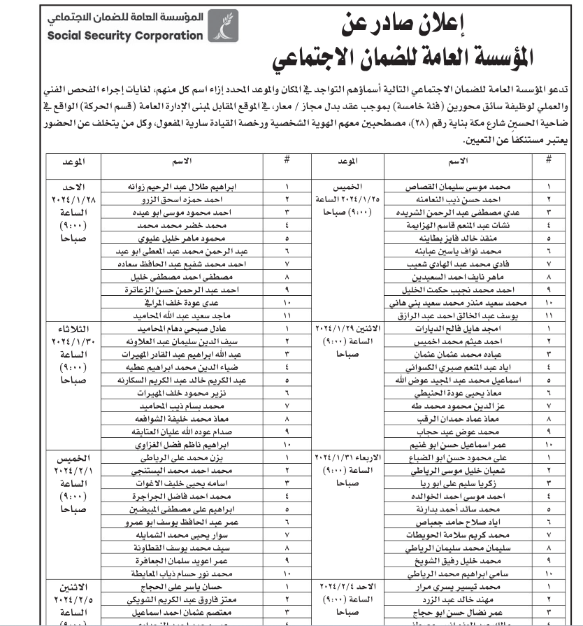 دعت المؤسسة العامة للضمان الاجتماعي التالية أسماؤهم التواجد في المكان والموعد المحدد إزاء اسم كل منهم، لغايات إجراء الفحص الفني العملي لوظيفة سائق محورين وكل من يتخلف عن الحضور يعتبر مستنكفا عن التعيين.