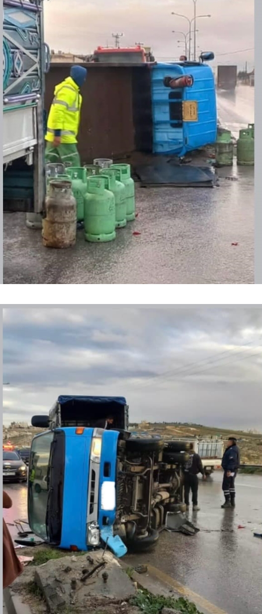 بالصور .. انقلاب مركبة شحن مُحملة بالغاز على شارع الحزام الدائري