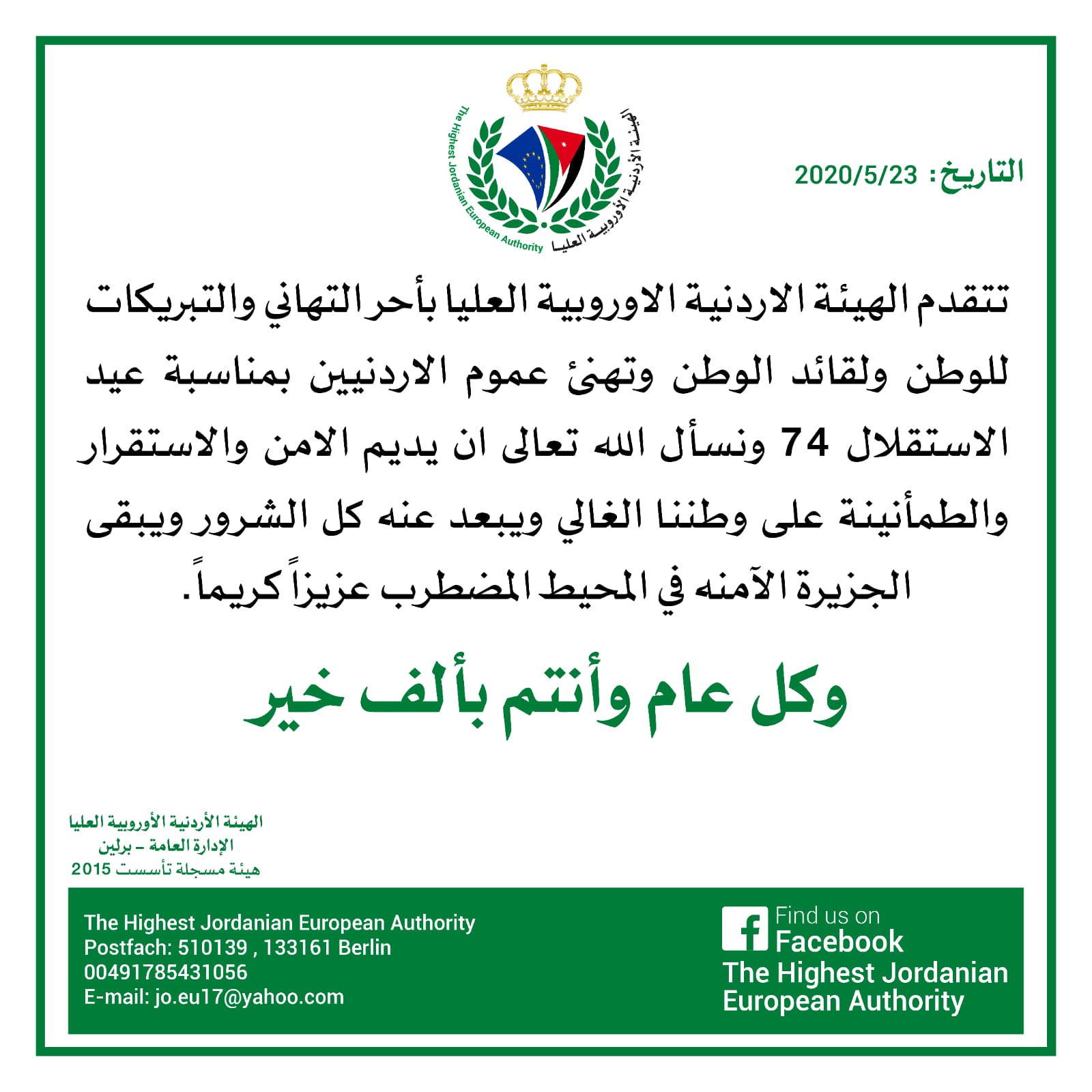 تتقدم الهيئة الاردنية الاوروبية العليا بأحر التهاني والتبريكات للوطن ولقائد الوطن وتهنئ عموم الاردنيين بمناسبة عيد الاستقلال 74 ونسأل الله تعالى ان يديم الامن والاستقرار والطمأنينة على وطننا الغالي ويبعد عنه كل الشرور ويبقى الجزيرة الآمنه في المحيط المضطرب عزيزا كريما