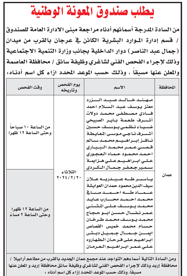 دعا صندوق المعونة الوطني الأشخاص المدرجة أسمائهم أدناه مراجعة مبنى الادارة العامة للصندوق / قسم إدارة الموارد البشرية الكائن في عرجان بالقرب من ميدان جمال عبد الناصر دوار الداخلية بجانب وزارة التنمية الاجتماعية وذلك لإجراء الفحص الفني لشاغري وظيفة سائق / محافظة العاصمة والمعلن عنها مسبقاً ، وذلك حسب الموعد المحدد إزاء كل اسم أدناه :