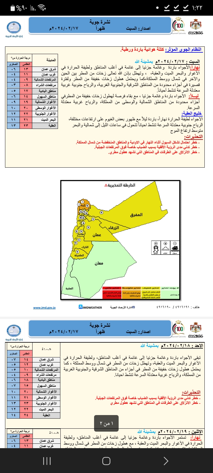ولمتابعة اخر التحديثات عن الحالة الجوية يرجى زيارة موقع وزارة النقل www.mot.gov.jo أو موقع إدارة الأرصاد الجوية www.jmd.gov.jo على شبكة الأنترنت أو على صفحات التواصل الاجتماعي FACEBOOK أو الأتصال على الموظف المناوب في مديرية التنبؤات الجوية على رقم 4916190 وأيضا على رقم 4916191 ، او عبر تطبيق الهواتف الذكية JMDWEATHER