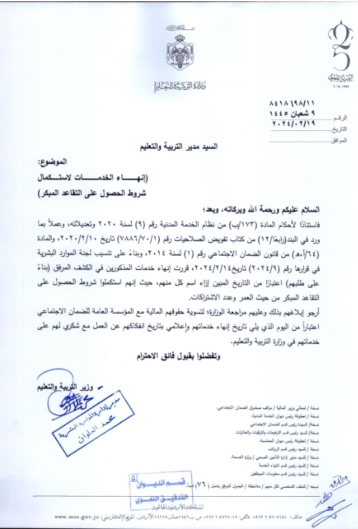 كما قرر وزير التربية والتعليم إنهاء خدمات موظفين، بناء على طلبهم، لاستكمالهم شروط الحصول على التقاعد المبكر من حيث العمر وعدد الاشتراكات.