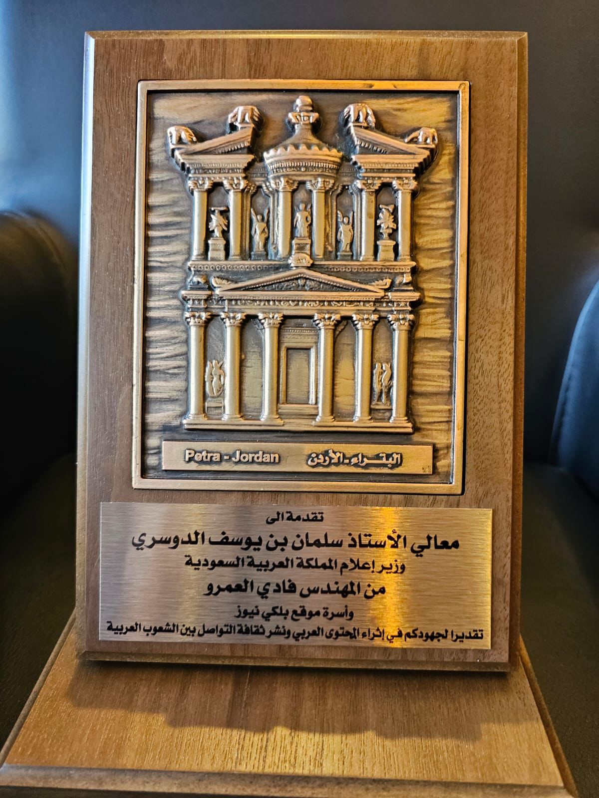 قدمت بلكي نيوز درع تذكاري لوزير الإعلام السعودي سلمان بن يوسف الدوسري خلال مأدبة غداء اقامها وزير الاتصال الحكومي الدكتور مهند مبيضين على شرفه والوفد المرافق له بفندق فيرمونت بحضور رئيس مجلس النواب احمد الصفدي وعدد من أصحاب المعالي والسعادة والعطوفة .