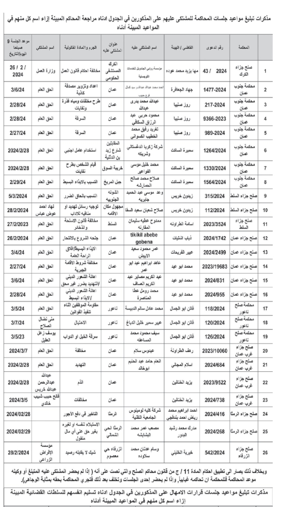 أمهلت محاكم، في مذكرات تبليغ، متهمين 10 أيَّام لتسليم أنفسهم للسلطات القضائية لمحاكمتهم على التهم المسندة إليهم، وإلا سيتم اعتبارهم فارين من وجه العدالة.ونشرت المحاكم، أسماء المتهمين، عملا بأحكام المادة 243 من قانون أصول المحاكمات الجزائية.وبينت أنَّه بانقضاء مدة الإمهال النافذة، وعدم تسليم أي منهم نفسه، سيعتبر المتهمون فارين من وجه العدالة وتوضع أموالهم تحت إدارة الحكومة، ويحرمون من التصرف بها طيلة فترة فرارهم، وسيتم منعهم من إقامة أيَّة دعاوى، وكل تصرف يقومون به أو التزام يتعهدون به باطل.وفي مذكرات أخرى، طالبت محاكم متهمين مراجعة المحاكم المبينة إزاء اسم كل منهم في المواعيد المبينة.وبخلاف ذلك يصار إلى تطبيق أحكام المادة 11/ج من قانون محاكم الصلح والتي نصت على أنه (إذا لم يحضر المشتكى عليه المتبلغ أو وكيله موعد المحاكمة فللمحكمة أن تحاكمه غيابيًا وإذا لم يحضر إحدى الجلسات وتخلف بعد ذلك فتجري المحاكمة بحقه بمثابة الوجاهي).كما طالبت مذكرات أخرى، من المشتكى عليهم مراجعة المحاكم المبينة إزاء اسم كل منهم في المواعيد المبينة.وبخلاف ذلك يصار إلى تطبيق أحكام الفقرة الثانية من المادة 212 من قانون أصول المحاكمات الجزائية والتي نصت على أنه (إذا لم يحضر المتهم الذي مثل أمام المدعي العام والمتبلغ موعد المحاكمة، فللمحكمة أن تحاكمه غيابيًا، وإذا حضر جلسات وتخلف بعد ذلك عن الحضور فتجري المحاكمة بحقه بمثابة الوجاهي، ويكون الحكم في الحالة الأولى قابلا للاعتراض وفقا للإجراءات المنصوص عليها في المواد من 184 إلى 189 من هذا القانون وفي الحالة الثانية قابلا للاستئناف ضمن المواعيد المحددة لذلك