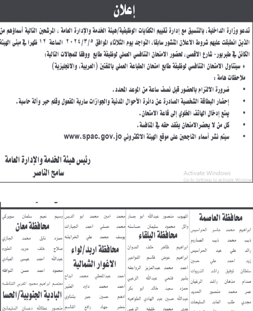 دعت وزارة الداخلية، بالتنسيق مع إدارة تقييم الكفايات الوظيفية هيئة الخدمة والإدارة العامة ، المرشحين التالية أسماؤهم التواجد يوم الثلاثاء الموافق 2024/3/5 الساعة 12 ظهرا في مبنى الهيئة الكائن في طبربور - شارع الاقصى، لحضور الامتحان التنافسي العملي لوظيفة طابع.