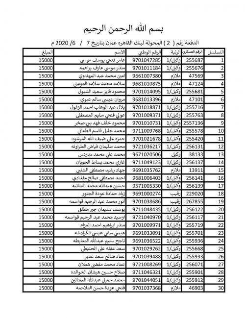نشرت القيادة العامة للقوات المسلحة الأردنية - الجيش العربي اليوم الاثنين كشف الدفعة الفرعية رقم (2) لمستحقي القروض الاسكانية لشهر حزيران.