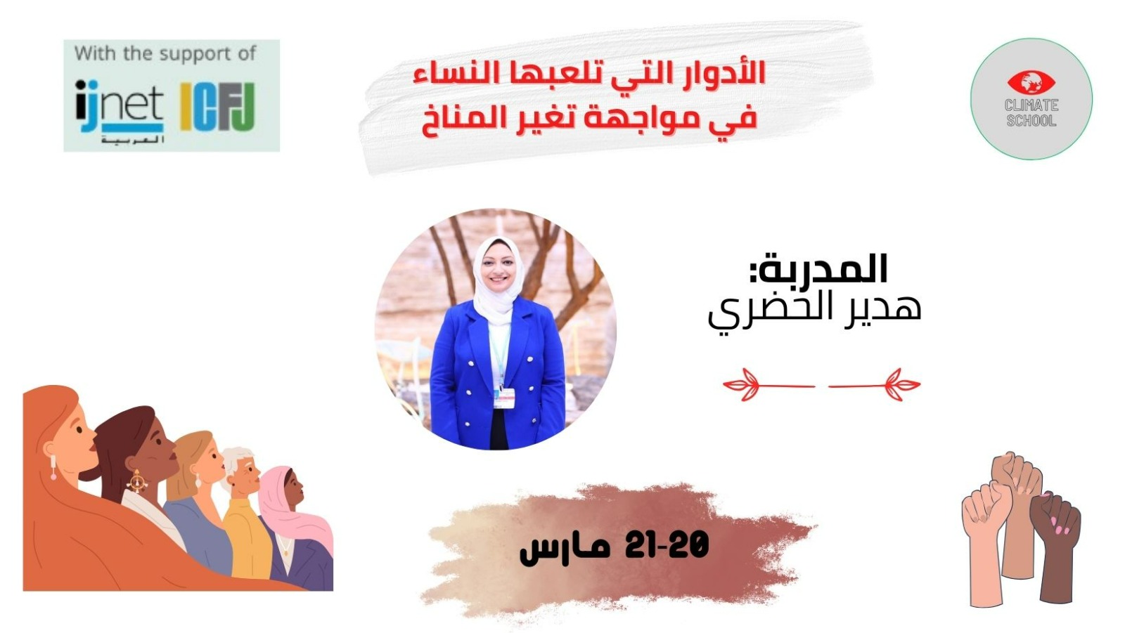 تنظم "مدرسة المناخ" تدريبا مكثفا على مدار يومي 20 و21 مارس 2024 بعنوان "الأدوار التي تلعبها النساء في مواجهة تغير المناخ"، وذلك بمنحة من برنامج مركز التوجيه المبادرات الإعلامية الناشئة في منطقة الشرق الأوسط وشمال أفريقيا، التابع لشبكة الصحفيين الدوليين.