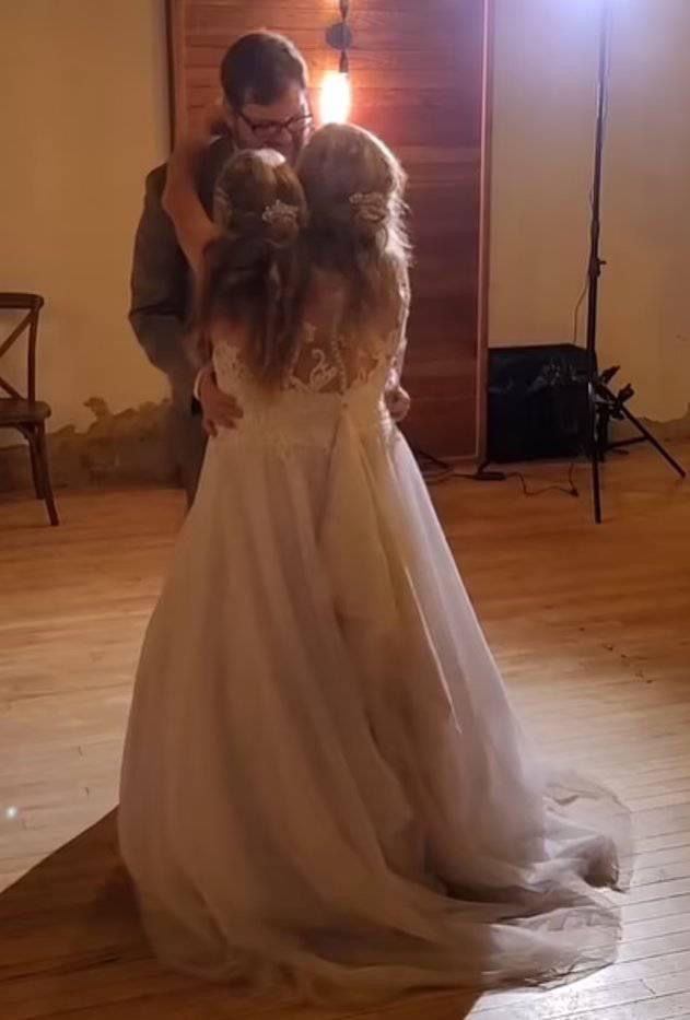 وأظهر مقطع فيديو يعتقد أنه تم التقاطه من قبل أحد الضيوف التوأم والعريس يستمتعان بالرقص بفستان زفاف مشترك.