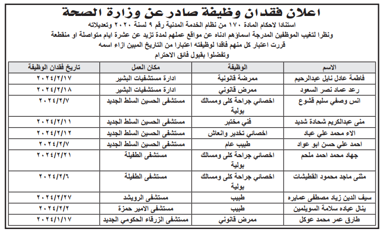 أعلنت وزارة الصحة، واستنادا لأحكام المادة 170 من نظام الخدمة المدنية، أن التالي أسماؤهم فاقدين لوظائفهم اعتباراً من التاريخ المبين إزاء اسم كل منهم.وأشارت الوزارة في الإعلان إلى أن قرار فقدان الوظيفة جاء لتغيب هؤلاء الموظفين عن عملهم لمدة تزيد عن 10 أيام متصلة أو متقطعة.