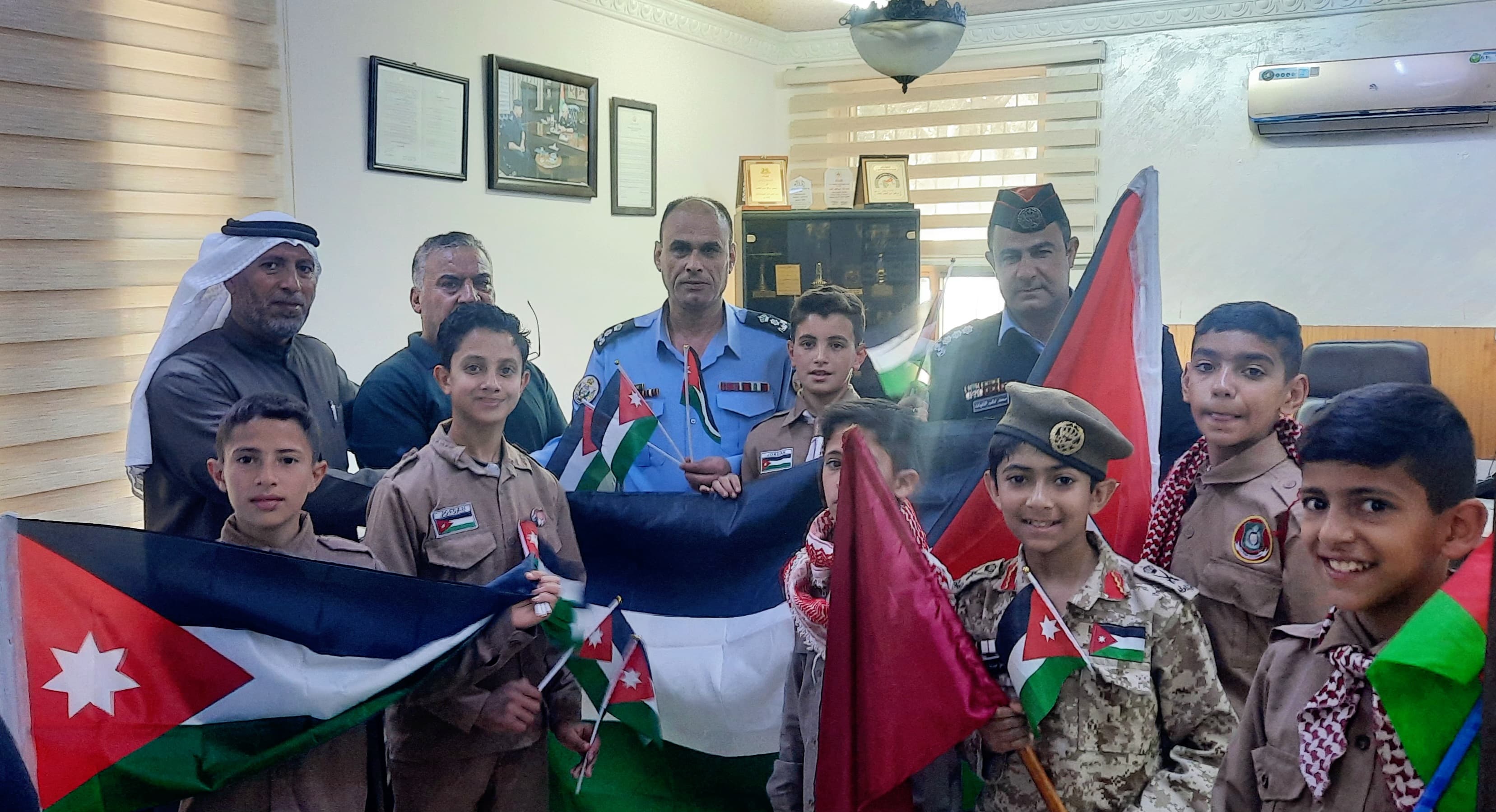 وتضمنت فعالية يوم العلم زيارة لعدد من الدوائر الحكومية والأمنية وتوزيع الأعلام ومشاركة الفرحة والبهجة بهذا اليوم العزيز على كل الاردنيين