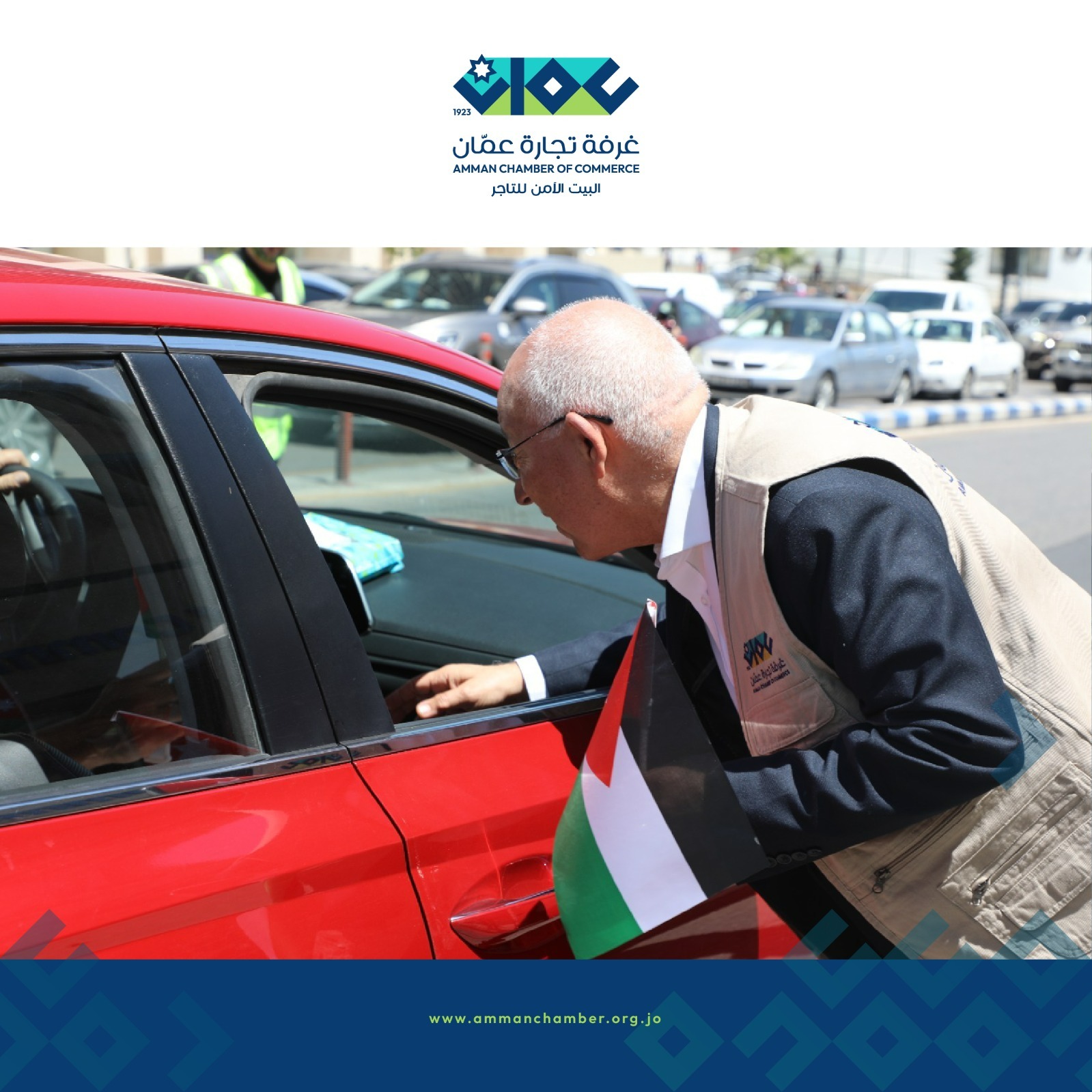 شاركت غرفة تجارة عمان اليوم الثلاثاء في حملة "علمناعال" من خلال توزيع الأعلام على المواطنين والسائقين في منطقة الشميساني، إحتفاءً باليوم الوطني للعلم الأردني، الذي يصادف 16 نيسان من كل عام.
