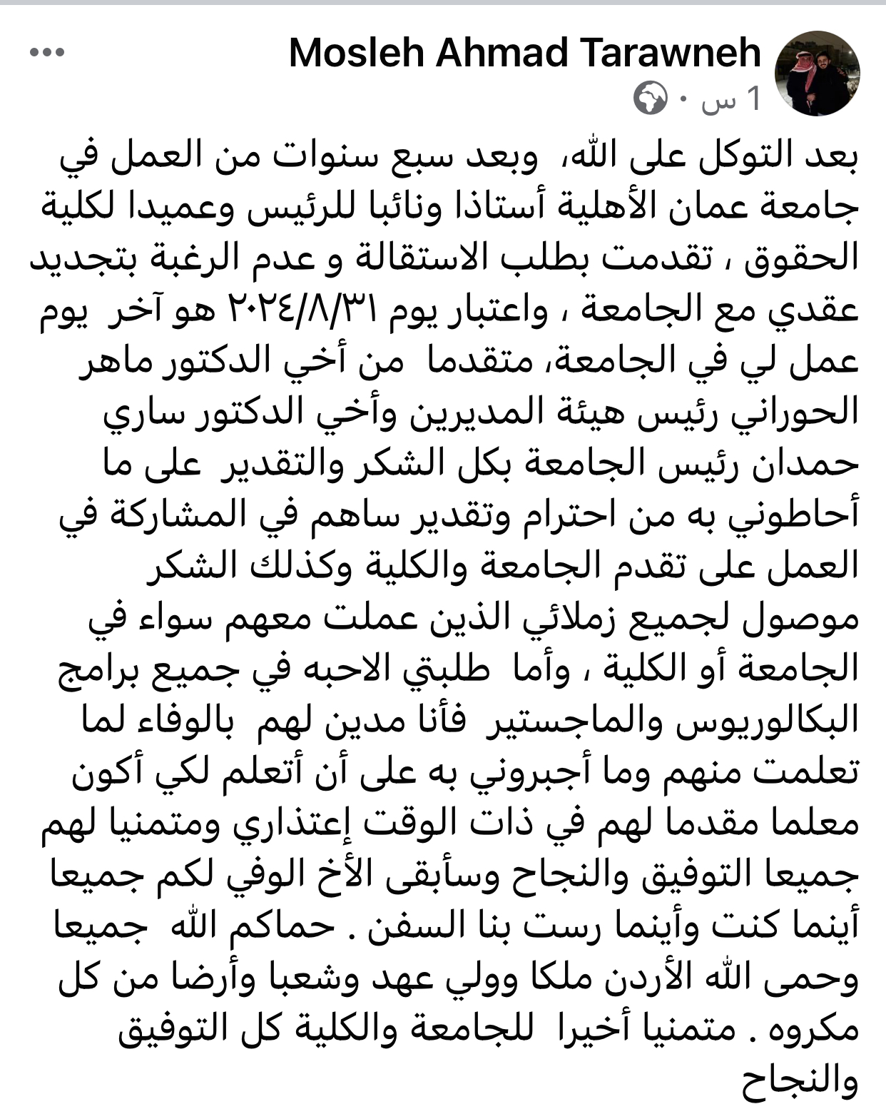 قال الأستاذ الدكتور مصلح الطراونة في ادراج على صفحته عبر الفيسبوك :- بعد التوكل على الله، وبعد سبع سنوات من العمل في جامعة عمان الأهلية أستاذا ونائبا للرئيس وعميدا لكلية الحقوق ، تقدمت بطلب الاستقالة و عدم الرغبة بتجديد عقدي مع الجامعة ، واعتبار يوم ٢٠٢٤/٨/٣١ هو آخر يوم عمل لي في الجامعة، متقدما من أخي الدكتور ماهر الحوراني رئيس هيئة المديرين وأخي الدكتور ساري حمدان رئيس الجامعة بكل الشكر والتقدير على ما أحاطوني به من احترام وتقدير ساهم في المشاركة في العمل على تقدم الجامعة والكلية وكذلك الشكر موصول لجميع زملائي الذين عملت معهم سواء في الجامعة أو الكلية ، وأما طلبتي الاحبه في جميع برامج البكالوريوس والماجستير فأنا مدين لهم بالوفاء لما تعلمت منهم وما أجبروني به على أن أتعلم لكي أكون معلما مقدما لهم في ذات الوقت إعتذاري ومتمنيا لهم جميعا التوفيق والنجاح وسأبقى الأخ الوفي لكم جميعا أينما كنت وأينما رست بنا السفن . حماكم الله جميعا وحمى الله الأردن ملكا وولي عهد وشعبا وأرضا من كل مكروه . متمنيا أخيرا للجامعة والكلية كل التوفيق والنجاح