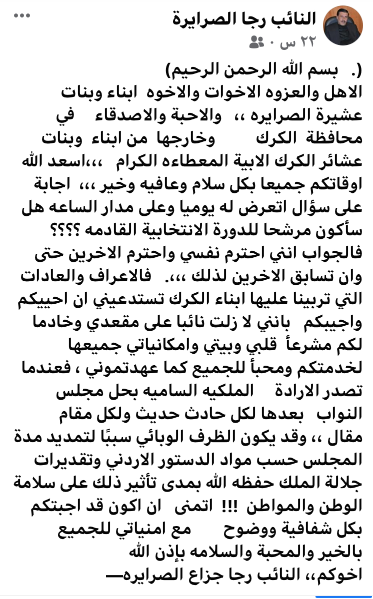 نشر النائب رجا الصرايرة ردا على استفسارات ابناء دائرته الانتخابية بالكرك حول اذا ما قرر الترشح للانتخابات النيابية القادمة ؟ وجاء رد الصرايرة عبر صفحته على الفيسبوك كما يلي :