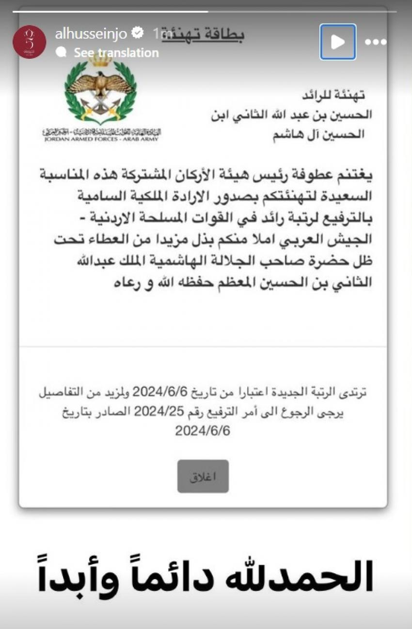 نشر ولي العهد الأمير الحسين بن عبدالله الثاني، عبر حسابه على انستغرام صورة لبطاقة التهنئة بمناسبة ترفيعه إلى رتبة رائد في الجيش العربي، بعد صدور الإرادة الملكية السامية.