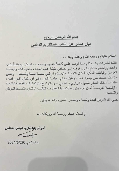 الدغمي يعلن تنحيه عن الترشح للانتخابات النيابية القادمة