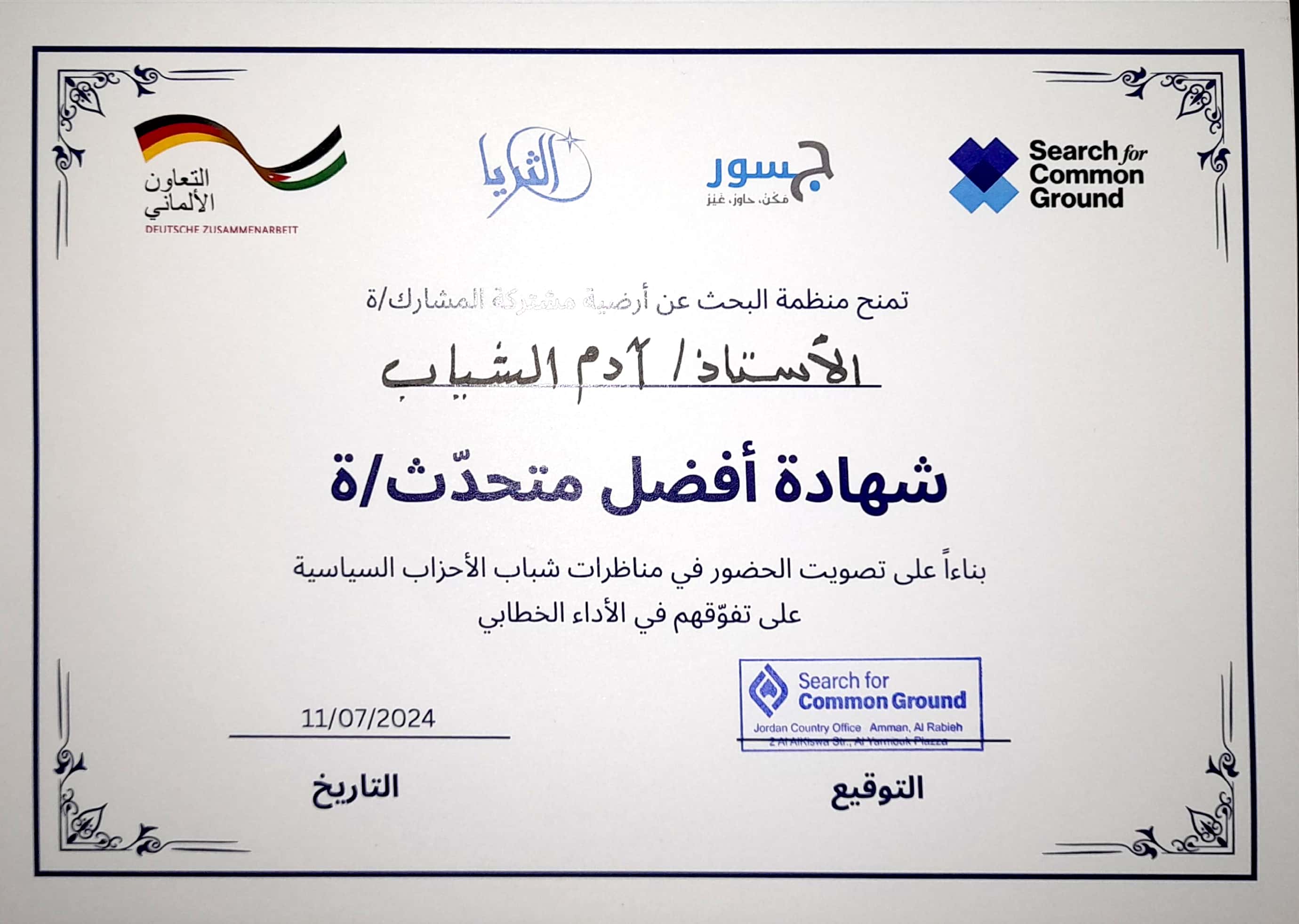 م. آدم الشياب افضل متحدث في مناظرات شباب الاحزاب السياسية