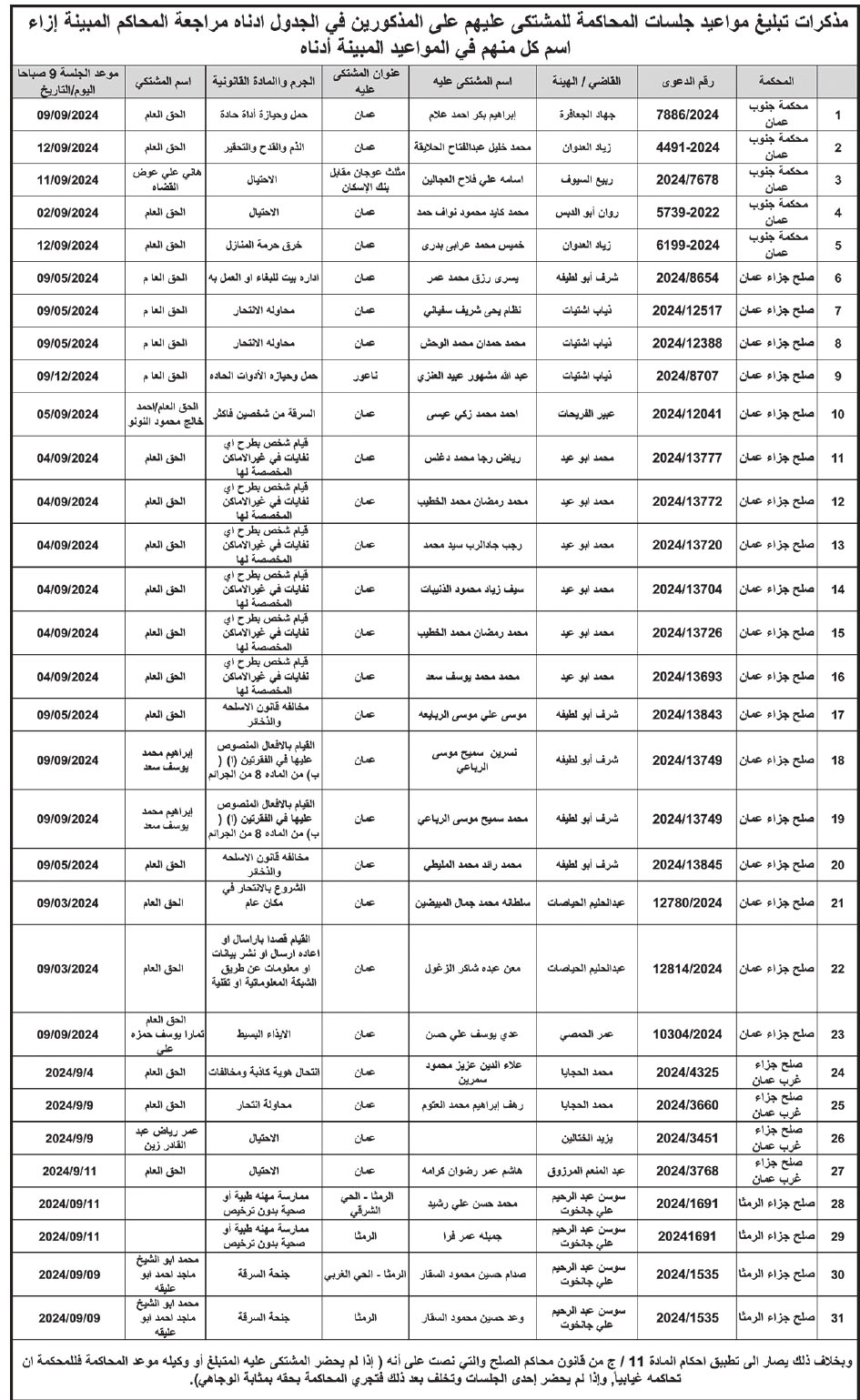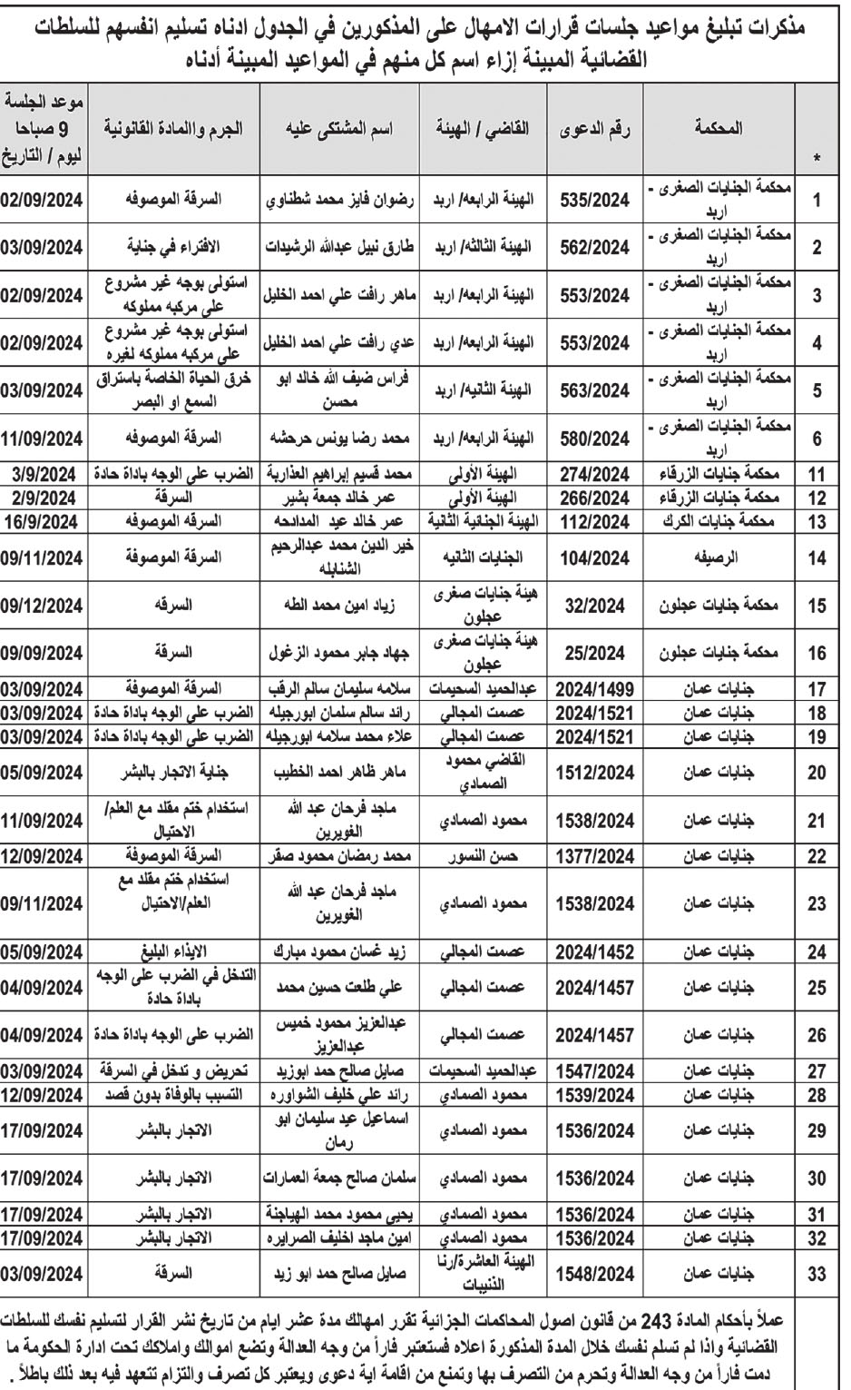 نشرت محاكم أردنية عبر الصحف اليومية الصادرة اليوم الاثنين، مذكرات تبليغ بمواعيد جلسات المحاكمة لمشتكى عليهم ولمتهمين ولأظناء وقرارات امهال. وطلبت المذكرات من المذكورين في الجداول أدناه مراجعة المحاكم المبينة إزاء اسم كل منهم في المواعيد المبينة أدناه. وتاليا التفاصيل والأسماء: