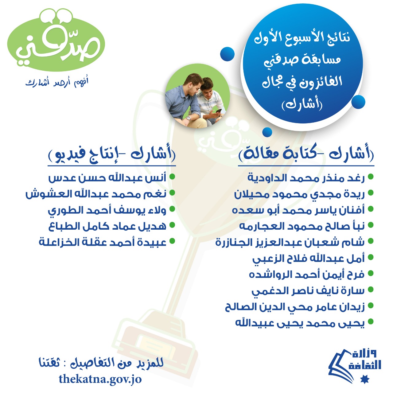 وفاز في فئة “أشارك مقالة”، ريدة مجدي محمود محيلان، وأفنان ياسر محمد ابو سعدة، ونبأ صالح محمود العجارمة، وشام شعبان عبدالعزيز الجنازرة، امل عبدالله فلاح الزعبي، فرح ايمن احمد الرواشده، سارة نايف ناصر الدغمي، وزيدان عامر محي الدين الصالح ويحيى محمد يحيى عبيدالله.
