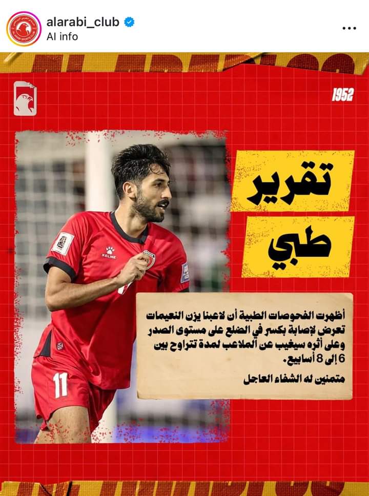 أعلن النادي العربي القطري، اليوم السبت، أن مهاجم المنتخب الوطني لكرة القدم يزن النعيمات سيغيب عن الملاعب لفترة تتراوح بين 6 إلى 8 أسابيع بعد تعرضه لإصابة. وقال النادي القطري الذي انتقل له النعيمات (25 عاما) هذا العام قادما من مواطنه الأهلي، في بيان عبر منصة "إكس" (تويتر سابقا)، "أظهرت الفحوصات الطبية أن لاعبنا يزن النعيمات تعرض لإصابة بكسر في الضلع على مستوى الصدر وعلى إثره سيغيب عن الملاعب لمدة تتراوح بين 6 إلى 8 أسابيع".