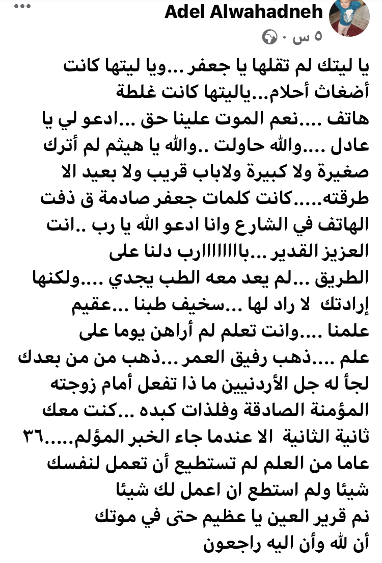 يا ليتك لم تقلها يا جعفر …ويا ليتها كانت أضغاث أحلام…ياليتها كانت غلطة هاتف ….نعم الموت علينا حق …ادعو لي يا عادل ….والله حاولت ..والله يا هيثم لم أترك صغيرة ولا كبيرة ولاباب قريب ولا بعيد الا طرقته…..كانت كلمات جعفر صادمة ق ذفت الهاتف في الشارع وانا ادعو الله يا رب ..انت العزيز القدير …باااااااارب دلنا على الطريق …لم يعد معه الطب يجدي ….ولكنها إرادتك لا راد لها …سخيف طبنا …عقيم علمنا ….وانت تعلم لم أراهن يوما على علم ….ذهب رفيق العمر …ذهب من من بعدك لجأ له جل الأردنيين ما ذا تفعل أمام زوجته المؤمنة الصادقة وفلذات كبده …كنت معك ثانية الثانية الا عندما جاء الخبر المؤلم…..٣٦ عاما من العلم لم تستطيع أن تعمل لنفسك شيئا ولم استطع ان اعمل لك شيئا