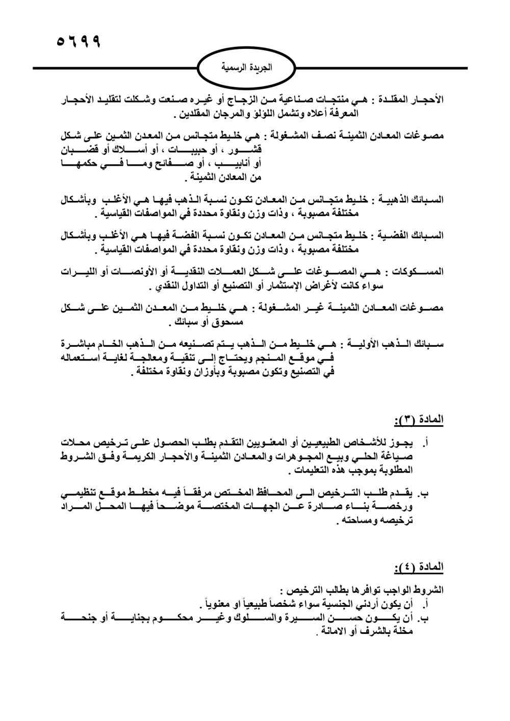 نشر في الجريدة الرسمية اليوم الاربعاء تعليمـــات ترخيص محلات صياغة الحلي وبيع المجوهرات والمعادن الثمينـة والأحجار الكريمة لسنة 2024 وتاليا التفاصيل:
